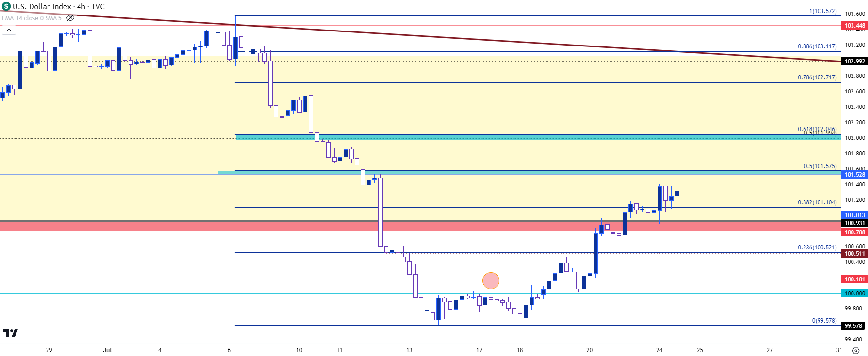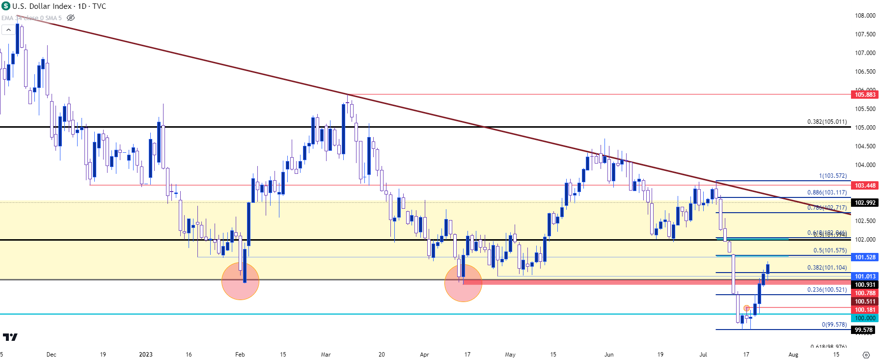 但是,正如我在那之后不久所说的,最大的问题是空头还有多少决心,我已经强调过先前作为支撑的区域,关注走低的高点阻力位会如何起作用。该区域位于2023年上半年的支撑位附近,在DXY图表上的100.80-101区域附近。