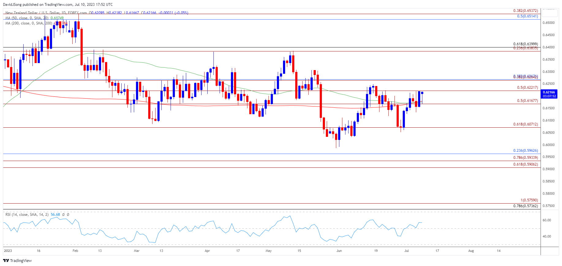 - 由于50日(0.6175)和200日(0.6178)均线,纽元/美元可能面临区间波动,但保持在月线低点(0.6127)之上的汇率可能会进一步尝试测试6月高点(0.6248),。